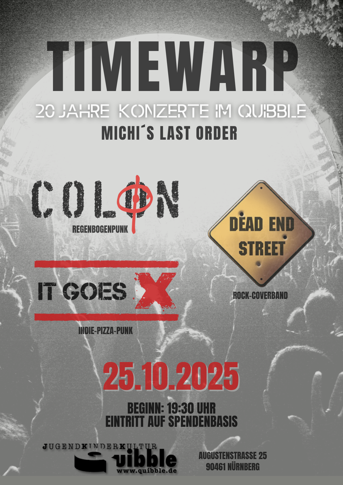 Deshalb gibt es hier nochmal einen Abriss der besonderen Art: Ein kleiner „Mini-Auszug“ der Konzerte der letzten 20 Jahre. Die Band des „Beginns“ bildet dabei Dead End Street, die 2005 das erste Mal im Quibble gespielt haben. Eine Band der „Mitte“ ist dann @colonrockt, die 2009 – 2013 bei uns vertreten waren. Und zu guter Letzt noch eine Band der „Neuzeit“: @itgoesx.